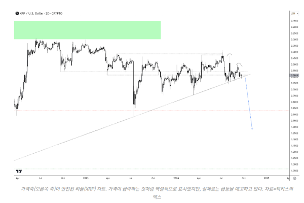 그러나 이 차트에는 대반전이 숨겨져 있다. 잭키스의 차트는 위아래가 뒤집혀 있다. 리플 가격의 약세와 붕괴를 암시하는 것처럼 보였던 차트가 사실은 강세를 시사하고 있는 것.