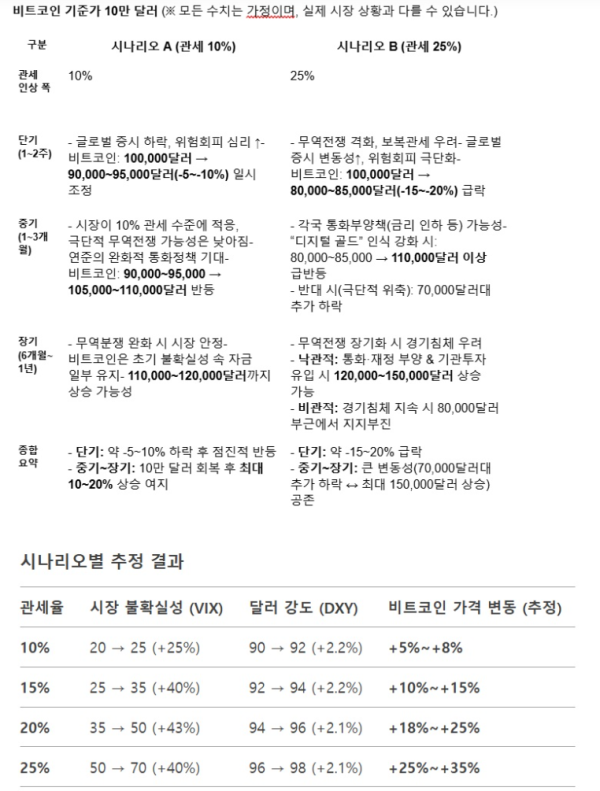 질문 : 미국이 주요 교역국을 대상으로 관세를 부과할 때 디지털 자산시장, 특히 비트코인 가격에 어떤 영향을 미칠 것인지 추론하는 모델을 만들고, 그 모델을 작동시켜서 결과를 알려줘. 관세를 최저 10%에서 최고 25%까지 부과하는 것을 전제로 해줘.