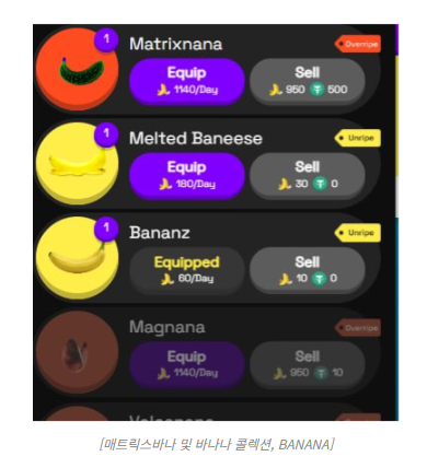 특히 수집한 바나나를 다양한 보상과 현금으로 교환할 수도 있어 사용자 참여도가 높다. 가장 희귀한 바나나인 매트릭스나나(Matrixnana)는 500 USDT에 판매된다.