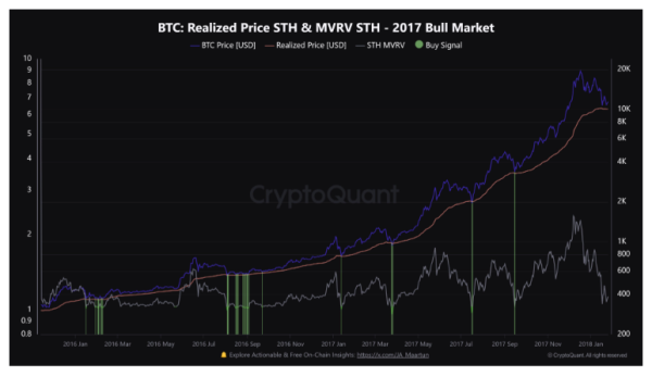 단기 보유자의 평균 매수 단가인 ‘단기 보유자 실현 가격(Short-Term Holder Realized Price)’ 은 강세장에서 매수 지지선으로 작용하는 경향이 있다.