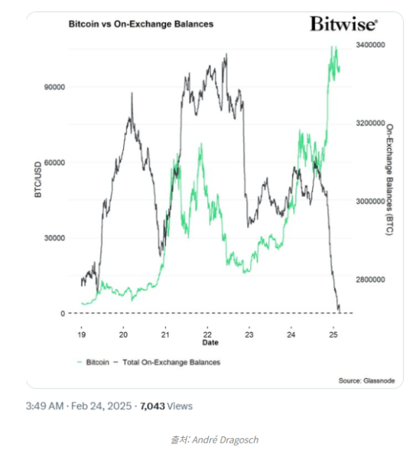 [뉴욕 = 장도선 특파원] 비트코인 가격이 최근 10만달러 아래서 정체 상태를 이어가는 가운데 거래소의 비트코인 보유량은 2018년 11월 이후 최저 수준으로 떨어졌다.