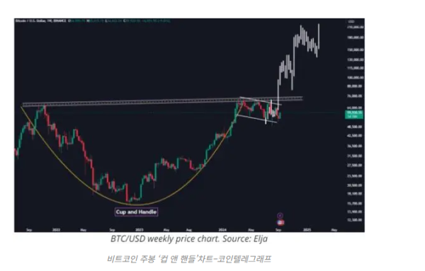 컵 앤 핸들 패턴은 가격이 목선 저항선을 돌파할 때 해결되며, 기술적 규칙에 따르면 목선과 컵의 최저점 간 최대 거리만큼 상승할 것으로 예상된다. 비트코인의 경우, 컵의 바닥(1만 5,000달러)과 저항선(약 6만 5,000달러) 사이의 거리는 약 5만 달러다. 분석가 엘자는 이 거리를 돌파 지점부터 위로반투영해, 2025년 초 BTC의 목표 범위를 11만 달러에서 15만 달러 사이로 설정했다.