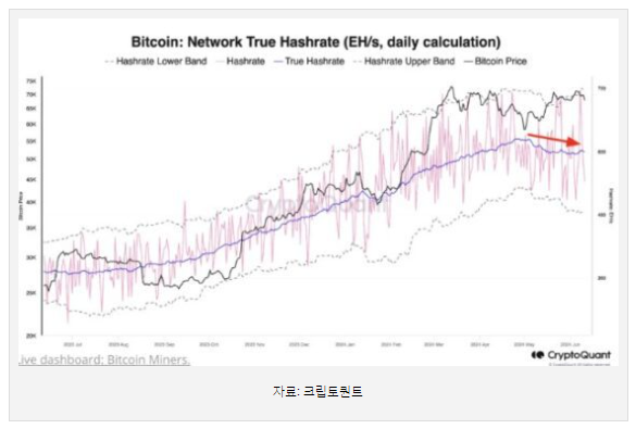 크립토퀀트 주기영 CEO는 X(구 트위터) 게시물에서 “비트코인 해시레이트의 18개월 상승 추세가 깨져 일부 채굴업체들의 커피출레이션을 시사한다”고 썼다.