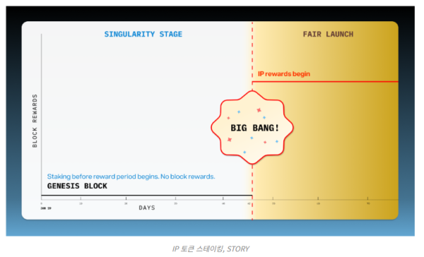 $IP의 공급 일정에 따라 커뮤니티는 메인넷 공개와 동시에 인센티브를 받을 수 있으며, 초기 투자자와 핵심 기여자의 토큰은 48개월에 걸쳐 단계적으로 해제된다. 또한, 공정한 스테이킹 모델을 도입해 초기 기여자가 선점하지 못하도록 했다. 1월 19일 생성 블록(Genesis Block) 이후 42일간의 ‘싱귤래리티 기간’ 동안 누구나 스테이킹을 할 수 있지만 보상은 지급되지 않는다. 이후 ‘빅뱅 이벤트’가 종료되면 모든 참여자가 동일한 시점에서 보상을 받을 수 있다.