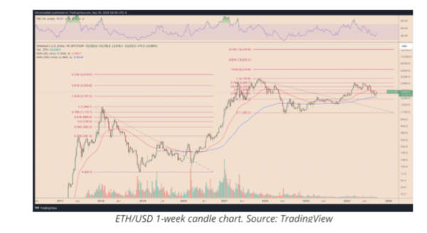 이더리움의 1만 달러 도달 가능성에 대한 두 번째 핵심 촉매제는 장기 피보나치 되돌림 그래프, 지수 이동 평균(EMA) 및 상대 강도 지수(RSI)로 구성된 또 다른 프랙탈에서 온다. 역사적으로, ETH의 가격 움직임은 2017-2018년과 2020-2021년 강세장에서 유사성을 보였으며 날카로운 조정이 기하급수적인 성장을 뒤따랐다.