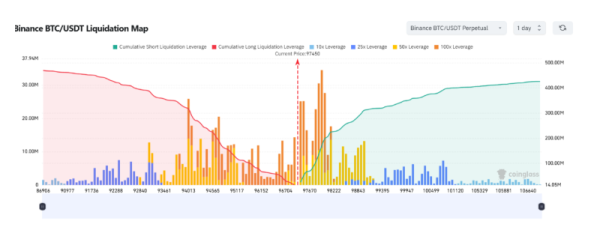 반대로 숏 포지션이 몰려있는 저항 구간은 9만8000달러에서 10만1000달러대다. 해당 구간을 돌파할 경우 연쇄 숏 청산이 발생해 가격이 급등할 수 있다.