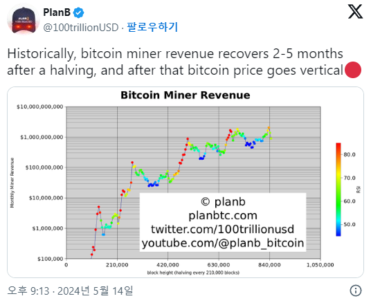[블록미디어 한성수 기자] 비트코인 분석가 플랜B가 낙관적인 전망을 내놨다. 비트코인 가격이 수직 상승하고, 채굴자 수익도 올라갈 것이라는 분석이다.
