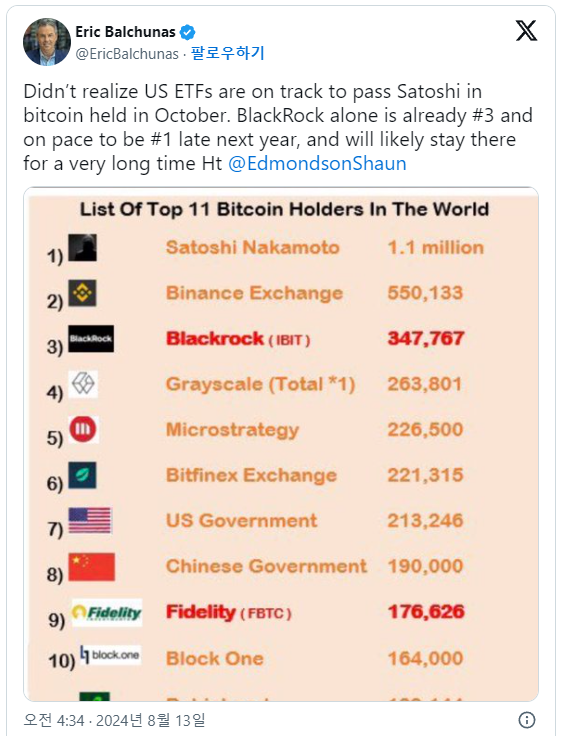 미국의 현물 비트코인 ETF들이 총 90만 1,000 BTC 이상을 보유하고 있으며, 주요 기업인 마이크로스트레티지(MicroStrategy)도 22만 6,500 BTC를 보유 중이다. 마이크로스트레티지는 비트코인을 더 구매할 계획으로 20억 달러를 추가로 조달하고 있다. 기관 투자자들이 대규모로 비트코인을 매수하며 공급을 더욱 축소시키고 있다.