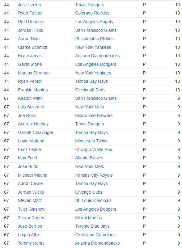 MLB 포볼 많이 허용하는 투수들 순서 페이지 정보 작성자 코린이 쪽지보내기 메일보내기 자기소개 아이디로 검색 전체게시물 쪽지보내기 메일보내기 자기소개 아이디로 검색 전체게시물 작성일 24-04-26 14:29 조회 2,621 댓글 0 본문 MLB 포볼 많이 허용하는 투수들 순서입니다투수로서는 안타보다 포볼을 많이 허용하는 게 더 안 좋습니다출처: https://www.teamrankings.com/ 관련링크 https://www.teamrankings.com/mlb/player-stat/walks 1037회 연결 댓글목록 0 등록된 댓글이 없습니다.