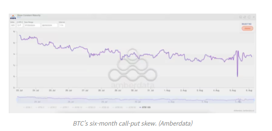 코인데스크는 또 앰버 데이터를 인용, 비트코인의 최근 가격 조정에도 불구하고 옵션 시장의 180일 콜 – 풋 스큐가 3 위에서 계속 안정적 흐름을 유지하는 것은 향후 6개월간 트레이더들의 강세 전망을 반영하는 것이라고 설명했다. 콜 – 풋 스큐가 플러스라는 것은 콜옵션 수요가 풋옵션 수요보다 많다는 것을 의미한다.