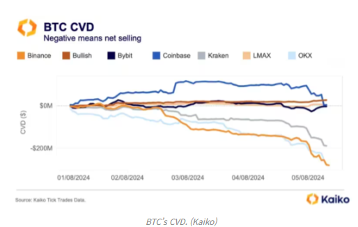 “흥미롭게도, 바이낸스와 OKX 같은 해외 거래소에서는 금요일 이후 강한 매도세를 목격했지만, 대부분의 미국 플랫폼에서 비트코인의 CVD는 플러스 상태를 유지, 일부 트레이더들의 저가매수를 시사한다”고 카이코는 노트에서 밝혔다.