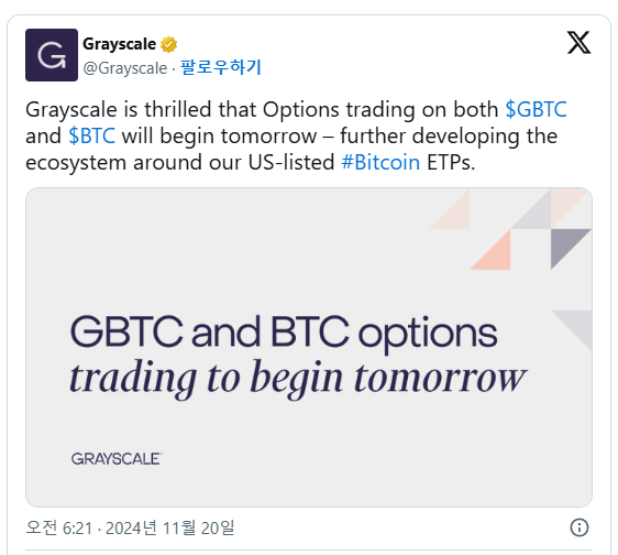 그레이스케일은 공식 X(옛 트위터) 계정에 “GBTC와 BTC 옵션거래가 20일부터 시작된다”며 “미국에 상장된 비트코인 상장지수상품(ETP) 생태계가 발전하게 돼 기쁘다”고 적었다. GBTC는 그레이스케일 비트코인 트러스트, BTC는 그레이스케일 비트코인 미니 트러스트를 뜻한다.