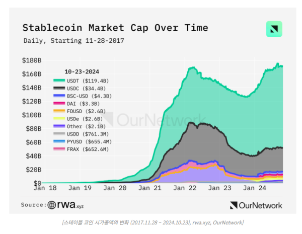 현재 글로벌 스테이블코인 시가총액은 약 1709억3000만 달러로, 2019년 이후 100배 이상 증가하며 성장세를 유지하고 있다.![]()