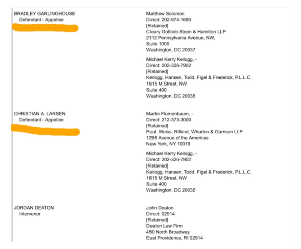 피항소인은 항소 사건의 상대방을 뜻한다. 1심에서 SEC는 당초 리플 랩스와 갈링하우스 및 라센을 피고인으로 소송전을 벌였으나, 두 사람에 대한 소송은 중도에 철회했었다. 이번에 항소를 제기하면서 SEC가 두 사람을 다시 피항소인으로 등재한 것.