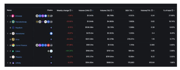 디파이라마에서 TVL 흐름을 비교하면 특정 네트워크가 얼마나 주목받고 있는지 알 수 있지만, DEX(탈중앙화 거래소) 거래량을 추적하면 특정 시점에서 암호화폐 산업 전반에 대한 관심도를 더 깊이 이해할 수 있다. 특히, 온체인 활동을 반영하는 지표로 유용하다. ![]()