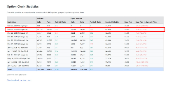 특히 IBIT 옵션 체인에서는 맥스 페인(Max Pain) 가격이 55.50으로, 현재 비트코인 가격 대비 1.74% 하락을 예상하고 있다. 이는 옵션 만기일(11월 29일) 이전에 비트코인 가격이 추가적으로 조정을 받을 가능성을 시사한다.