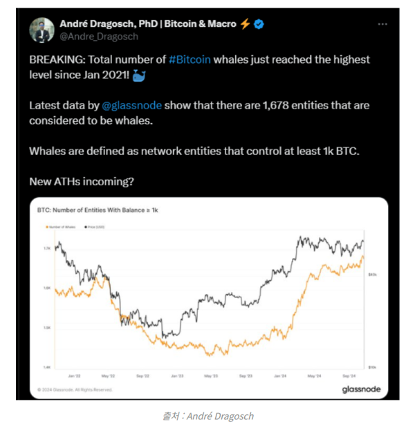 코인데스크에 따르면 비트코인 고래 숫자는 이번 주 초반 1678로 증가하며, 2021년 1월 이후 최고치를 기록했다. 고래 숫자 증가는 글래스노드와 비트와이즈의 유럽 연구 책임자인 안드레 드라고쉬가 추적해 밝혀냈다.