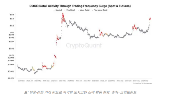 기영주 CEO는 “포모가 온 것은 오히려 도지코인(DOGE)”이라며 개인 투자자들이 비트코인이 아닌 밈코인을 쫓고 있다고 분석했다. 근거로는 도지코인 소매 활동 지표가 ‘소매 투자 과다'(Too Many Retail)을 가리키고 있다는 점을 들었다. 모든 거래소에서 도지코인 거래 건수가 사상 최고치를 기록했다는 점도 포모 신호로 봤다.