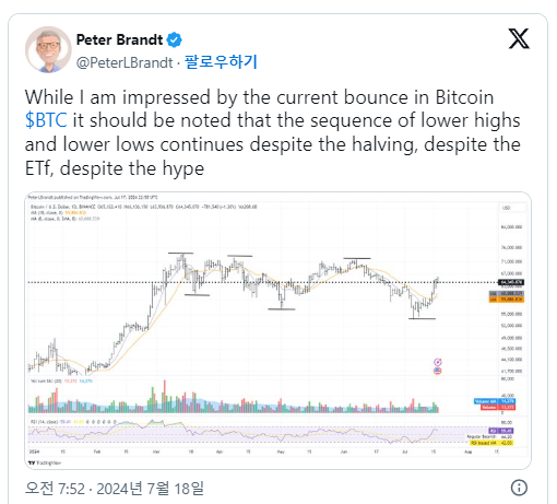 전설적인 트레이더이자 차트 분석가인 피터 브랜트가 반등에도 불구하고 차트상 나타난 하락 가능성을 유념해야 한다고 17일(현지 시간) 트윘했다.