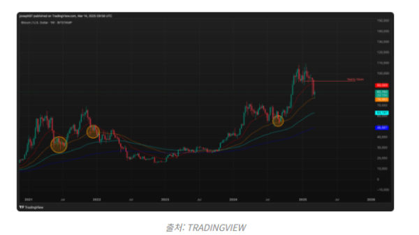 코인데스크에 따르면 비트코인은 ‘주간 50일 지수이동평균선(weekly 50-day EMA)’에서 반등했다. 이는 과거 상승 추세에서 중요한 지지선 역할을 수행했다.