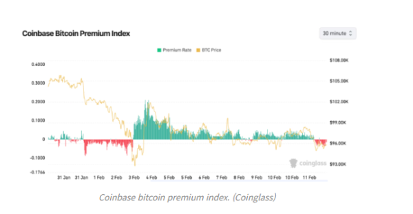 코인베이스 프리미엄의 마이너스 전환은 간밤에 목격된 비트코인의 완만한 반등은 미국 투자자들이 아닌, 해외 거래소에서 활동하는 투자자들에 의해 주도된 것이었음을 시사한다. 비트코인은 전일 오후 9만5000달러 아래로 떨어졌다가 아시아와 유럽 시간대 9만6000달러 위로 반등했다. 그러나 이날 예상을 웃도는 미국의 1월 소비자물가지수(CPI) 발표 후 다시 9만6000달러 아래로 하락했다.