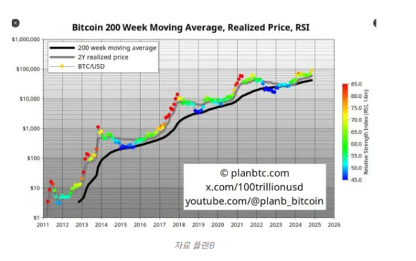 플랜B는 또한 비트코인의 상대강도지수(RSI)가 과거 강세장 정점 수준에 도달하지 않았다고 언급했다. 이는 현재의 상승세가 지속될 가능성을 높이는 신호로 해석된다.![]()