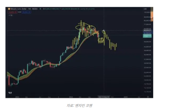 코웬은 비트코인이 과거와 같은 움직임을 따른다면 100주 이동 평균인 약 4만 달러 가격대에 도달할 가능성이 높다고 밝혔다.