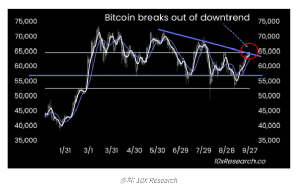 27일(현지 시간) 코인데스크에 따르면 10X 리서치의 설립자 마커스 틸렌은 비트코인이 연방준비제도(연준)의 금리 인하로 하락 추세에서 벗어나 7만 달러, 이어 사상 최고가 경신을 지금 겨냥하고 있다고 밝혔다.