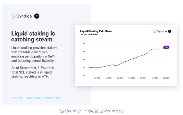 신디카는 유동성 스테이킹이 빠르게 확산되고 있다고 밝혔다. 유동성 스테이킹은 스테이커들이 거래 가능한 파생상품을 제공받아 디파이에 참여할 수 있게 해주며, 전체 유동성을 높인다. 9월 기준으로, 전체 SOL 스테이킹의 7.2%가 유동성 스테이킹에 잠겨 있으며, 이는 사상 최고치를 기록했다.