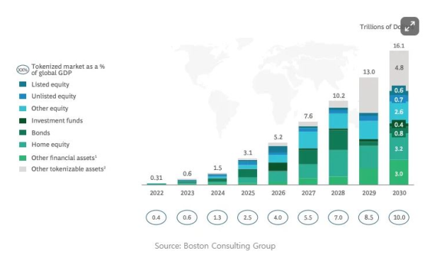자산운용사 21.co는 2030년까지 모든 자산 계열에서 토큰화 시장이 10조 달러 규모로 성장할 수 있다고 전망하고 있다. 특히, RWA 토큰화는 기존 주식 시장에서의 ETF와는 달리, 소매 투자자들이 접근하기 어려웠던 비유동성 자산이나 고액 자산을 중심으로 발전할 것이라는 설명이다.