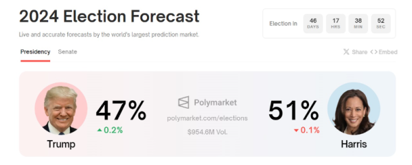 폴리마켓 “해리스, 6개 경합주에서 4곳 앞서” …트럼프와 승률 격차 더 벌렸다
